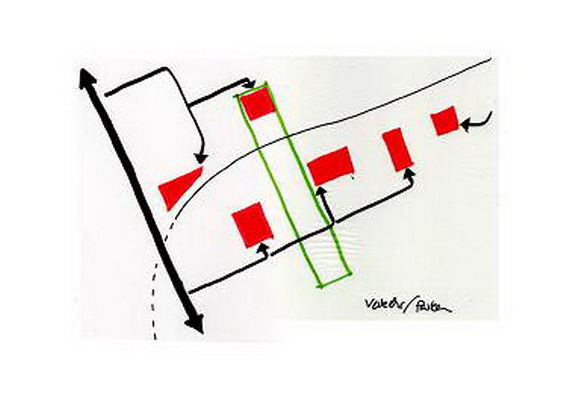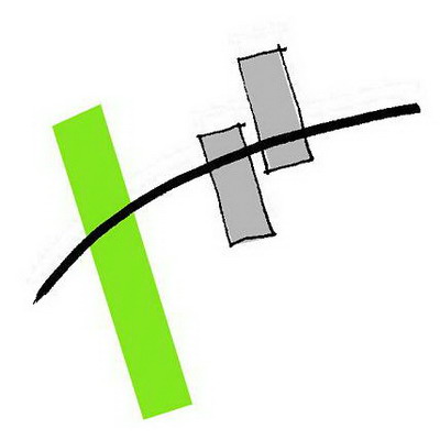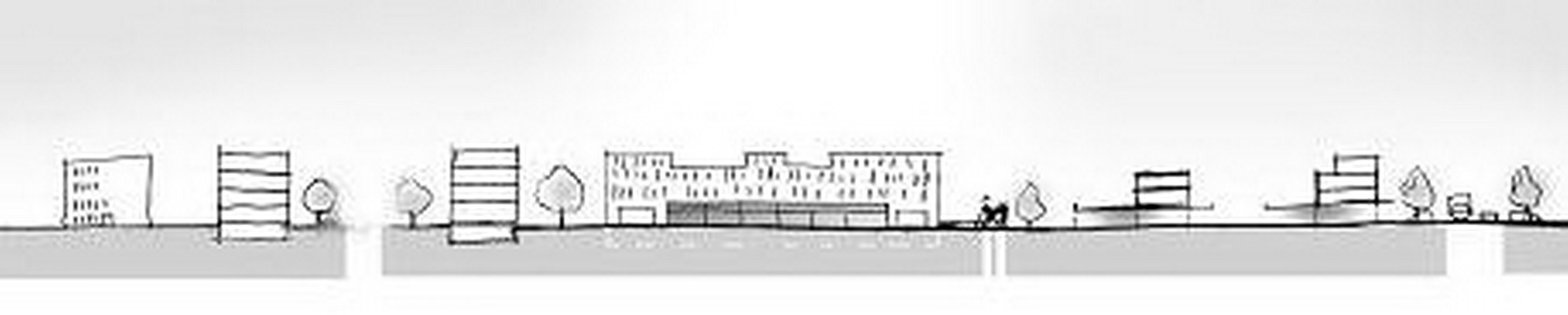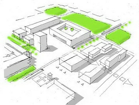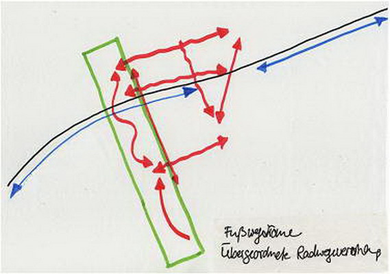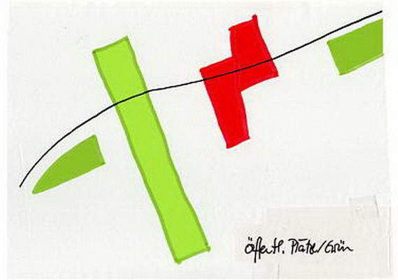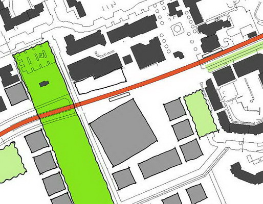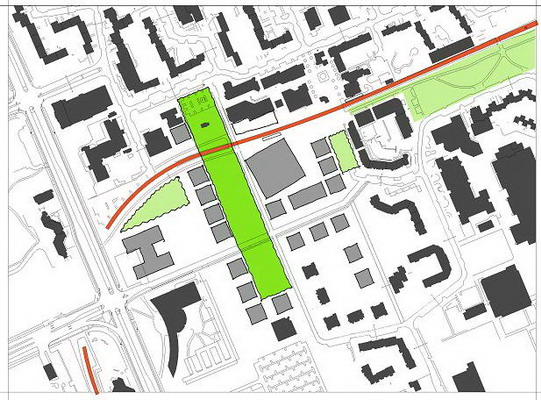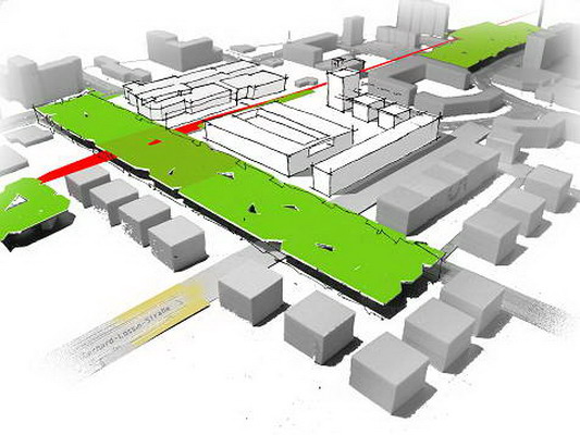 Die praxisnahe Aufgabenstellung löste meine Gruppe mit einem „Centralpark“ der den Roderbruch nördlich und südlich der Bahnlinie als Grünzug verbindet. Der alte und neue Marktplatz (graue Felder) werden zwar von der Straßenbahn durchfahren, aber nicht durch die Schienen getrennt, da diese an dieser Stelle geschwindigkeitsmäßig den Fußgängern untergeordnet sein soll (Bsp. Ernst-August-Platz). Um die neuen Gestaltungselemente herum soll Geschosswohnungsbau enstehen, um den öffentlichen Raum mit harten Kanten zu fassen.